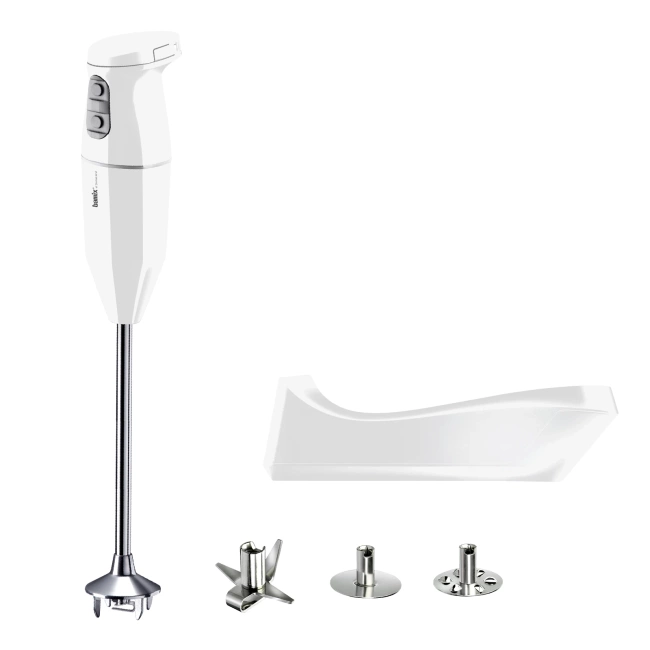Ergonomiczny uchwyt i intuicyjne rozmieszczenie przycisków zapewniają komfort użytkowania. Dodatkowym atutem jest wydłużona nasadka miksująca, która pozwala pracować w wysokich naczyniach i blendować większe porcje.